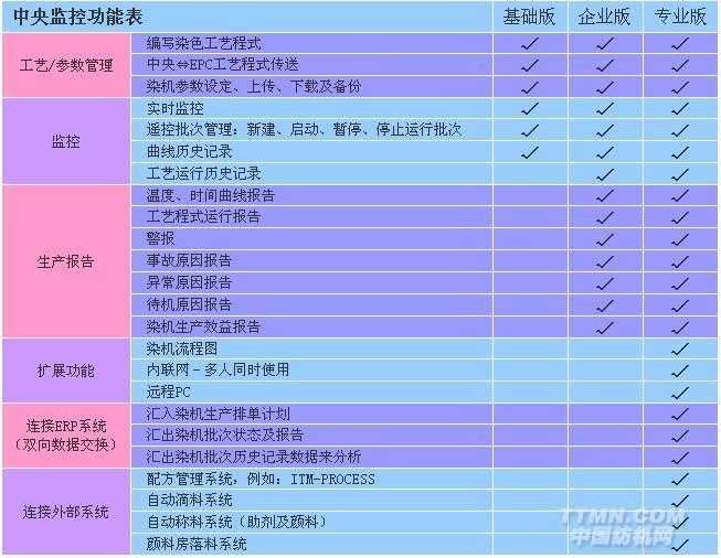 該系統(tǒng)是第一次參展,應(yīng)用于染色設(shè)備的中央實(shí)時(shí)監(jiān)控,包括工藝/參數(shù)管理、實(shí)時(shí)監(jiān)控、生產(chǎn)管理等模塊,可以進(jìn)行染色工藝程序編制、傳送,染色機(jī)參數(shù)設(shè)定、上傳、下載和備份;批次調(diào)度管理,新建、啟動(dòng)、暫?;蛲V惯\(yùn)行的批次,記錄運(yùn)行歷史和曲線;生成溫度、時(shí)間曲線,工藝程序運(yùn)行報(bào)告,異常報(bào)警,事故原因分析,生產(chǎn)效益報(bào)告等。還可以進(jìn)行可視化染色機(jī)狀態(tài)顯示,遠(yuǎn)程終端診斷等??梢赃B接外部的配方管理系統(tǒng)、自動(dòng)分料系統(tǒng)、自動(dòng)稱料系統(tǒng)等。與 ERP 聯(lián)網(wǎng)后,可以導(dǎo)入染色機(jī)生產(chǎn)計(jì)劃,導(dǎo)出染色機(jī)批次狀態(tài)信息和批次歷史記錄數(shù)據(jù)等。