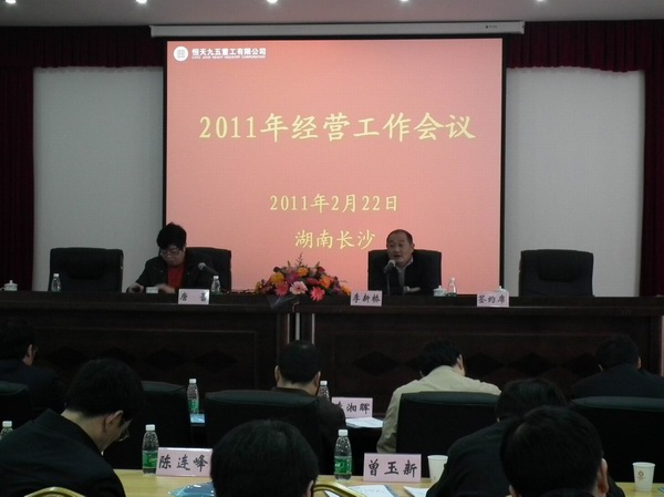 一年之計在于春,在中國恒天集團增資擴股、原長天九五整體更名為“恒天九五重工有限公司”并成功掛牌后,第一個春節顯得意義非凡。2月22日,恒天九五重工有限公司迎來了初春的第一場大會——2011年經營工作會議。這也是公司重組后第一次召開經營工作會議,董事長唐蕾、總經理李新橋,各分子公司、事業部中高層領導共60余人參加了此次會議。本次會議是在繼1月24日恒天重工股份有限公司召開的集團經營工作會議,對恒天九五重工下達了2011年目標任務書后,恒天九五重工為認真貫徹恒天重工年度工作會議精神,深入分析經濟發展的態勢,研究部署2011年各項工作,并將任務向事業部、子公司進行分解,特召開了本次經營工作會議。