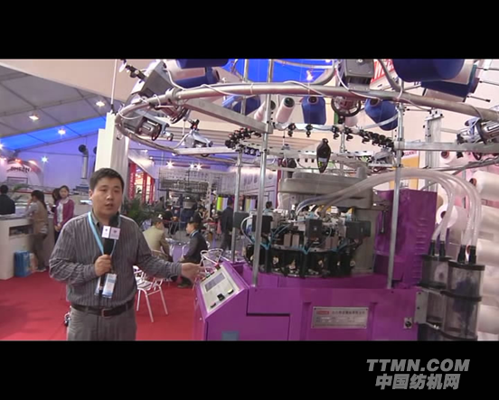 凹凸精機(jī)的業(yè)務(wù)經(jīng)理朱安在為中國(guó)紡機(jī)網(wǎng)廣大網(wǎng)友介紹他身后的這臺(tái)單面針織機(jī)