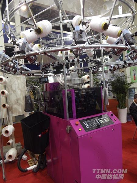 陳:這次我們展會帶來了幾個比較特殊的產(chǎn)品,一個是移圈,分好幾種,84針,120針,96針的。這次最新推出一個4寸120針的移圈,它做褲襪橫拉可以達(dá)到45以上,這個不但滿足日韓市場,在歐美市場和俄羅斯市場也是比較風(fēng)行的。然后在夢幻任意拉毛這個機器,我們推出了夢幻的 ,雙路頸線任意拉毛和單路頸線任意拉毛。這兩款機型,目前這兩款機型在國內(nèi)來說,在行業(yè)里來說也是比較超前的,另外一個就是無縫內(nèi)衣機,無縫內(nèi)衣機我們推出了一個有頭機12路頸線,目前是第一家首推出來的,它的產(chǎn)量在市場原有8輪頸線的基礎(chǔ)上至少提高了30%的產(chǎn)量,大概目前是這樣子。