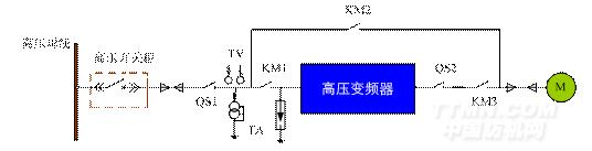10kV電源經高壓開關柜到高壓變頻器的電源切換柜,經高壓隔離開關QS1、KM1到高壓變頻器的移相整流側,高壓變頻器的調頻電源經高壓隔離開關QS2及KM3到高壓電機,KM2及KM3彼此電氣互鎖, 但高壓變頻器出現故障時,KM3跳脫,KM2閉合,系統自動切換到工頻電源運行,避免高爐因高壓變頻器故障產生風口灌渣事故,確保煉鐵生產的持續可靠運行。