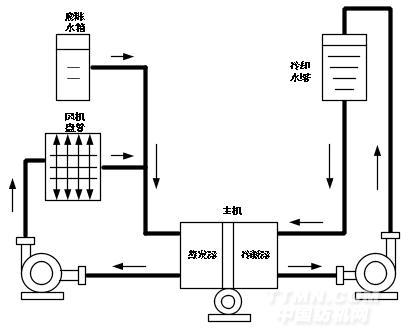 該部分由冷卻泵、冷卻水管道、冷卻水塔及冷凝器等組成。冷凍水循環(huán)系統(tǒng)進(jìn)行室內(nèi)熱交換的同時(shí),必將帶走室內(nèi)大量的熱能。該熱能通過(guò)主機(jī)內(nèi)的冷媒傳遞給冷卻水,使冷卻水溫度升高。冷卻泵將升溫后的冷卻水壓入冷卻水塔(出水),使之與大氣進(jìn)行熱交換,降低溫度后再送回主機(jī)冷凝器(回水)。