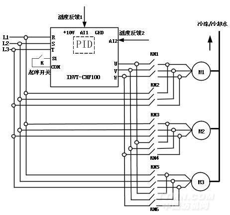 分別在主機(jī)蒸發(fā)器回水處、冷凝器出水及回水處安裝溫度傳感器,實(shí)時(shí)檢測(cè)管網(wǎng)的溫度,以模擬信號(hào)(0~10V或者4~20mA)反饋給變頻器,通過(guò)變頻器內(nèi)置的PID運(yùn)算輸出相應(yīng)的頻率指令后自動(dòng)調(diào)節(jié)水泵轉(zhuǎn)速,從而調(diào)節(jié)各循環(huán)水的熱交換速度,最終實(shí)現(xiàn)對(duì)室內(nèi)恒溫度的控制。需要特別說(shuō)明的是,變頻器內(nèi)部在設(shè)計(jì)上集成了溫差反饋處理功能,系統(tǒng)無(wú)須另配專用控制模塊。