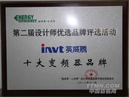 012年11月30日,英威騰在由賽爾傳媒、中國設計師網主辦的“第二屆設計師優選品牌頒獎盛典”中榮膺“設計師十大優選變頻器品牌”和“誠信或作伙伴獎”,連續兩屆蟬聯該項殊榮。