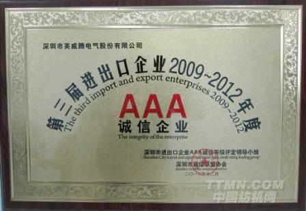 2012年12月,英威騰獲評為“第三屆進出口AAA誠信企業”,與華為、中興、創維等企業同時入選。據悉,獲認定的企業將享受到海關、檢驗檢疫等政府部門提供的多項優惠待遇,及享受海關綠色通關便利。