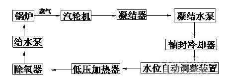 汽輪機(jī)做功后的尾氣大部分蒸氣被凝結(jié)器循環(huán)冷卻水冷凝成水,凝結(jié)水進(jìn)入熱井中,由凝結(jié)泵(兩用一備)抽出,經(jīng)軸封冷卻器和水位自動(dòng)調(diào)整裝置后,一部分通過低壓加熱器經(jīng)過加熱后送至除氧器;另一部分通過再循環(huán)調(diào)節(jié)閥回到熱井中,保證熱井液位。凝結(jié)水泵工藝流程圖如下圖2所示: