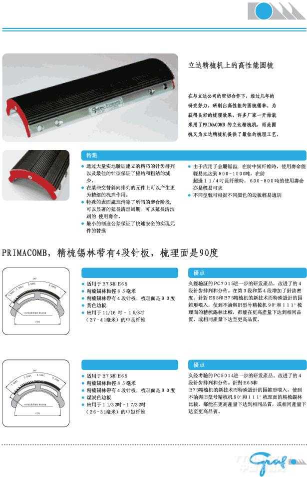 具有 111°梳理面的高性能精梳錫林,有 3 種型號:5015、5028、5030。適合梳理中長型纖維,落棉率分別大于 18%、20%、22%。具有的優點: