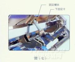 安裝搖架前,必須松開下固定卡,把搖架放在支承管上,使凸出的傳壓曲柄裝進傳壓杯(見圖六),然后把下固定卡抱合住支承管,再把固定螺母擰緊。(見圖七)