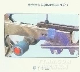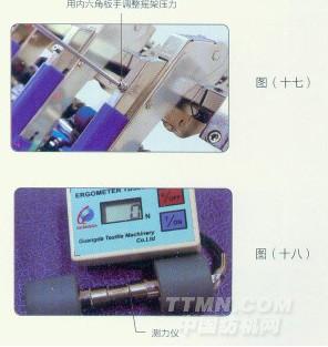 在分別對每個搖架進行調整時,前皮輥用加壓電子測力儀代替。把搖架置于工作位置,這樣及可借助加壓測力儀上的表面指示,利用搖架手柄上的壓力調節螺釘來調整加壓載荷,壓力調節螺釘調壓后,測力儀應正確顯示所需的壓力值,(見圖十七、十八)。