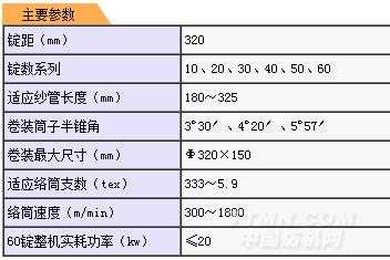 卷裝筒子: 圓錐形卷裝筒子,半錐角:3o30、4o20、5o57 卷繞規格:寬度150mm最大卷裝直徑320mm