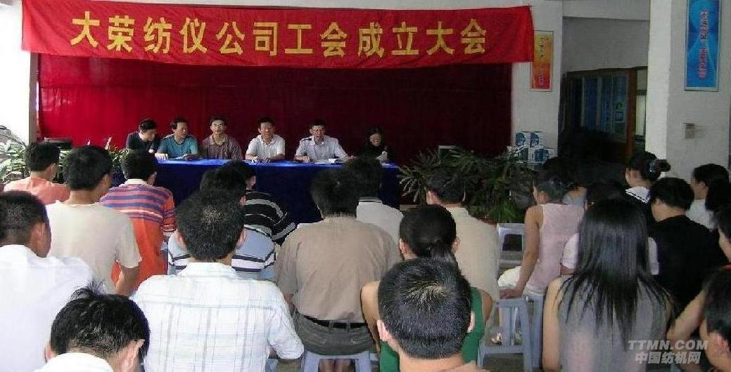 經(jīng)過幾個月的充分醞釀和準備,大榮紡儀公司工會委員會于九月二十七日下午召開的成立大會上,在隆重熱烈的氣氛中宣告成立。工會是職工自愿結合的工人階級群眾組織是黨聯(lián)系職工群眾的橋梁和紐帶,是國家政權的重要支柱,大榮紡儀公司工會的成立是大榮職工政治生活中的一件大喜事,標志著大榮公司各項組織的進一步健全。成立大會上,主持人張孟勝副總經(jīng)理闡述了工會的宗旨和會員的義務和權利。大會通過無記名投票方式,直接采用候選人數(shù)多于應選人數(shù)的差額選舉辦法選舉產(chǎn)生了第一屆工會委員會委員。大榮公司董事長吳昭彪在大會上發(fā)表了熱情洋溢的講話,表示全力支持工會組織的工作并作了鄭重的承諾。還向每個會員贈送了紀念品。大榮紡儀公司的職工大都來自祖國各地,其中雙職工占了很大的比例,工會的成立更使他們感到大家庭的溫暖,從到會的每一位職工臉上綻放的笑容就充分表達他們的美好愿望和對未來的企盼。同時也讓每個新當選的工會委員深切感到自己肩負的使命與責任。