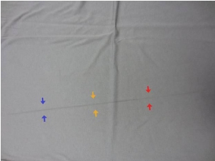 色折痕,又稱行機痕,水痕,直條痕等(見圖一)。主要是因為織物在染機繩狀運行時,經(jīng)向折迭部分長時間沒有換位,造成起折部分顏色比其它部分偏深所致。組織結構比較緊密的平紋布最容易出現(xiàn)此問題。近年來,一方面隨著針織織機技術的飛速發(fā)展,織物的密度越來越高;另一方面隨著紡紗技術的發(fā)展,質(zhì)量較差的紗也經(jīng)過提高紡紗捻度等用作織造。這樣前道工序中過多的內(nèi)應力帶到后序染整加工來,造成織物收縮不一致,織物在運行中折迭部分不易換位,最終導致色折痕的產(chǎn)生。