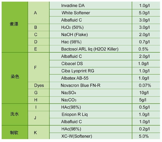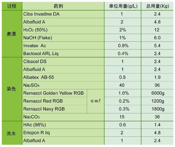 應客戶要求,處染 600kg 全棉 32S/2 平紋布,米克重 300g/m ,幅寬 248cm,軍綠色。在立信 JUMBOTEC 處染,使用大流量噴嘴設定,浴比為 1:4。