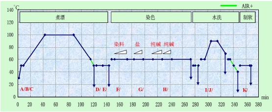 應客戶要求,處染 550kg 全棉 26S/1 平紋布,克重 160g/m2 ,幅寬 212cm,天藍色。此種織物為緊密布,采用普通設備染色易出現(xiàn)色折痕。在立信 JUMBOTEC 處染,使用大流量噴嘴設定,浴比為 1:5,即可以解決緊密針織織物的色折痕問題。