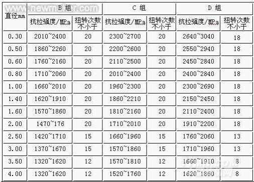 該標準是冷拉碳素彈簧鋼絲的通用標準,主要用于制作在各種應力狀態下工作的靜態彈簧。根據彈簧工作應力狀態鋼絲可分三個級別供貨:B級用于低應力彈簧,C級用于中等應力彈簧,D級用于高應力彈簧。成品鋼絲考核抗拉強度、扭轉、纏繞和彎曲四項性能,常見規格的力學性能如表4。