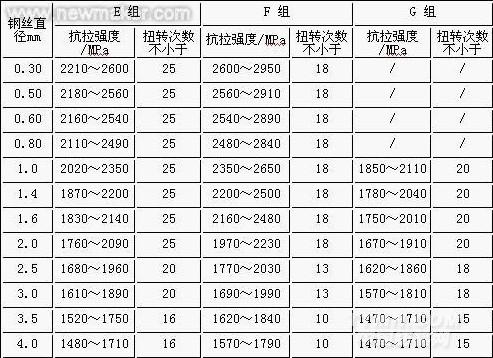 按該標準供貨的鋼絲,主要用于制作在各種應力狀態下工作的動態彈簧。根據彈簧工作應力狀態,鋼絲分3個組別供貨:E組適用于中等應力動態彈簧,F組適用于高應力動態彈簧,G組適用于高疲勞壽命的動態彈簧。成品鋼絲考核抗拉強度,扭轉,纏繞,彎曲和脫碳五項性能指標,常見規格的力學性能如表5。