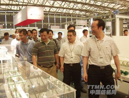 中國紡織協會會長王天凱(前右四)、中國恒天集團公司董事長、黨委書記張杰(前右二)與公司董事長總經理杜榮念(前右三)蒞臨展位視察指導