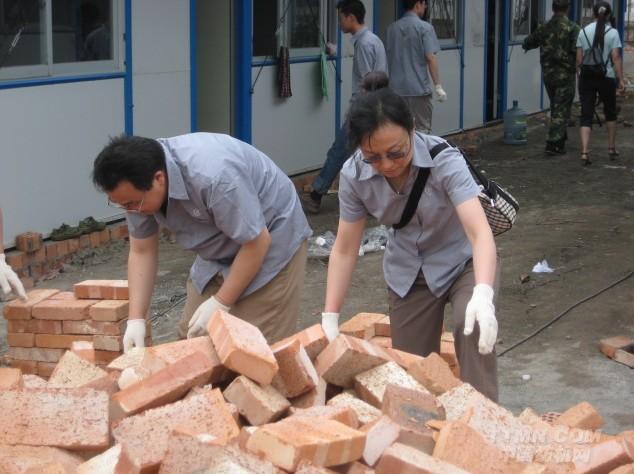 離開小漁洞,車隊(duì)來到通濟(jì)鎮(zhèn),看望慰問了成華區(qū)人武部救災(zāi)指揮駐地的官兵,并在當(dāng)?shù)亟M織開展黨員實(shí)踐活動(dòng),以實(shí)際行動(dòng)支援災(zāi)區(qū)的家園重建。六十多名志愿者分成幾個(gè)小組,分別負(fù)責(zé)對(duì)臨時(shí)安置活動(dòng)板房施工現(xiàn)場(chǎng)的安裝材料進(jìn)行歸類和場(chǎng)地清理工作,有的手抬肩扛,運(yùn)渣土,抬磚塊,有的拿起鋤頭,鐵鍬等工具平整房間地面,組成愛心接力,將厚厚的隔墻板等裝修材料傳遞到指定位置。對(duì)臟和累,大家毫無(wú)怨言,只想能盡快搭建起溫暖的家園。中午,為了不給災(zāi)區(qū)增添負(fù)擔(dān),參加活動(dòng)的志愿者個(gè)個(gè)自帶干糧,站在停靠車隊(duì)的馬路邊匆匆吃完午飯,顧不上休息,又繼續(xù)投入施工現(xiàn)場(chǎng)進(jìn)行清理。