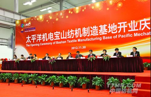 【TTMN訊 涵子】2012年11月30日上午,太平洋機電(集團)有限公司在上海寶山區隆重舉行太平洋機電寶山紡機制造基地開業慶典。中國紡織工業聯合會副會長兼秘書長高勇;中國紡織機械器材工業協會理事長王樹田;中國棉紡織行業協會會長朱北娜;中國化學纖維工業協會會長端小平;上海寶山區副區長秦文波;上海電氣(集團)總公司黨委副書記李健勁、工會主席朱斌;上海市政協原副主席黃關從;太平洋機電集團總裁、黨委副書記葉富才,黨委書記、副總裁杜松楊等領導;國內外近150多家用戶代表;以及其他領導和嘉賓共200余人出席。太平洋機電集團黨委書記、副總裁杜松楊主持了開業慶典。