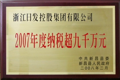 在2月14日召開的全縣經濟工作會議上,新昌縣人民政府通報表彰了2007年度納稅超千萬元企業(集團)名單,日發控股集團納稅超九千萬元,在全縣納稅排行榜上位列第五,被縣委縣政府授予榮譽獎牌。 此外,為鼓勵企業做大做強,會議還表彰了在2007年涌現出來的一批優秀企業經營者,集團總裁吳捷榜上有名,榮獲“新昌縣經濟發展優秀人才”稱號。
