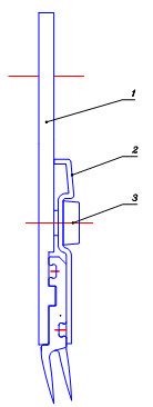 與單排頂梳相比,雙排梳針的頂梳只是將單排針片改為雙排針片,前后排保持較小距離。如圖所示,用嵌條4將針片6嵌裝成雙排針條5,由壓板2通過螺釘3正確固裝于頂梳板1上,即成雙排梳針的頂梳。