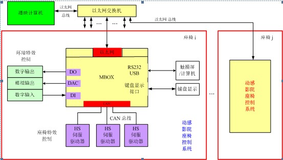 在該方案中,播映計算機通過以太網(wǎng)交換機(如以太網(wǎng)有線方式路由,WiFi無線方式路由,電力網(wǎng)絡(luò)路由器)連接到每個座椅的MBOX通訊控制器,進行控制與狀態(tài)信息的交互。MBOX的數(shù)字輸出與模擬輸出控制對應(yīng)的環(huán)境特效,數(shù)字輸入接收個性化環(huán)境指令,配置了RS232或USB接口實現(xiàn)本地的計算機或觸摸屏運行監(jiān)控和參數(shù)設(shè)置,配置了鍵盤顯示接口實現(xiàn)手動方式的運行監(jiān)控和參數(shù)設(shè)置。MBOX還配置了用于移動座椅的伺服電機控制用的CAN通訊接口,該接口與和利時電機技術(shù)有限公司的HS系列網(wǎng)絡(luò)化伺服驅(qū)動器通過自定義的CAN總線通訊協(xié)議實現(xiàn)對電機的運動控制,通過CAN總線可以配置動感座椅3個軸的獨立或聯(lián)動運動控制。