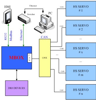[--page--]下圖是HS網(wǎng)絡(luò)化伺服驅(qū)動器使用CAN總線和MBOX通訊控制器構(gòu)成網(wǎng)絡(luò)化伺服控制系統(tǒng)的典型構(gòu)架。MBOX與上位計算機之間通過交換機實現(xiàn)以太網(wǎng)的通訊,MBOX與HS伺服之間實現(xiàn)CAN總線的通訊,另外,MBOX還可以與本地計算機或觸摸屏實現(xiàn)基于通過RS232等接口的MODBUS通訊,便于監(jiān)控和調(diào)試。同時, MBOX還可以提供8路數(shù)字輸入,12路數(shù)字輸出及2路模擬量輸出接口。