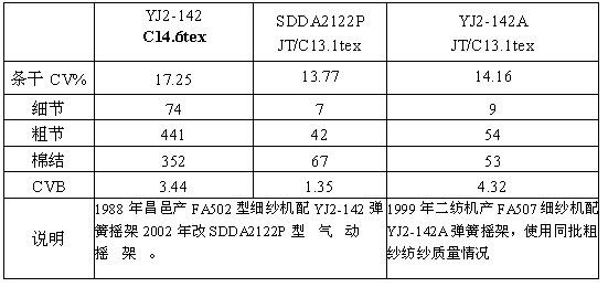 (3)、新疆五家渠聯(lián)營棉紡織廠對其72臺FA503(配YJ2-142搖架)進(jìn)行了改造,其中36臺改造為SDDA2122P氣動"V"型牽伸搖架,36臺改為德國緒森公司HP-310型板簧搖架。紡紗質(zhì)量狀況如下: