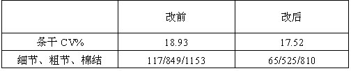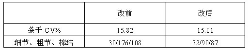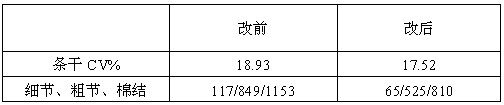 以上數(shù)據(jù)表明,改后比改前條干CV%值降低1%,細(xì)節(jié)、粗節(jié)、棉結(jié)都有較大程度降低。