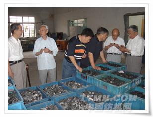 雙帆總經理姜國海(右起第一位)和唐文輝教授(左起第一位)、張懷良副理事長(左起第二位)參觀雙帆搖架用戶使用現場