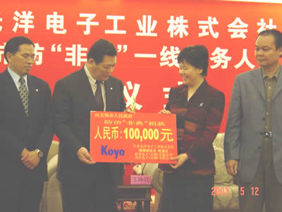 昨天是國際護(hù)士節(jié),在這個(gè)特別的日子里,無錫市湖濱飯店舉行了防“非典”捐款活動(dòng)。日本光洋電子首先向市政府捐贈(zèng)了10萬元人民幣,全力支持市政府抗非工作。同時(shí)這也是無錫市政府收到的第一筆, 由在錫外企愛心捐贈(zèng)的抗非款。無錫市的一些主要領(lǐng)導(dǎo)人、抗非戰(zhàn)線中領(lǐng)導(dǎo)人員以及光洋電子嚴(yán)金榮總經(jīng)理、研光電子的吉田裕參加了這次活動(dòng)。