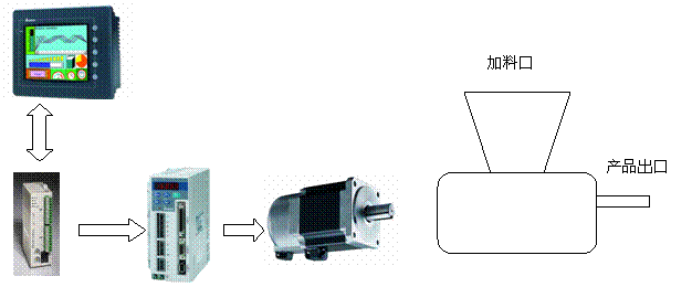 項(xiàng)目屬于機(jī)械設(shè)備的系統(tǒng),要求精度較高,工藝過(guò)程相對(duì)復(fù)雜。主要要求如下:通過(guò)設(shè)定不同檔次的腸料,可以加工3種規(guī)格的產(chǎn)品;要求實(shí)際偏差不得超過(guò)±5g;要求可設(shè)定手動(dòng)和自動(dòng)連續(xù)運(yùn)行;要求伺服的速度能夠連續(xù)調(diào)整;偏差微調(diào)功能,并且顯示微調(diào)值;