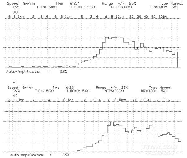 a)在高速380鉗次/min工作時(shí),40㎝左右有較低的接合波,而在330鉗次/min以下工作時(shí),無(wú)明顯的結(jié)合波,機(jī)械狀態(tài)良好,性能穩(wěn)定可靠,能滿足現(xiàn)代高效精梳工藝的質(zhì)量要求。