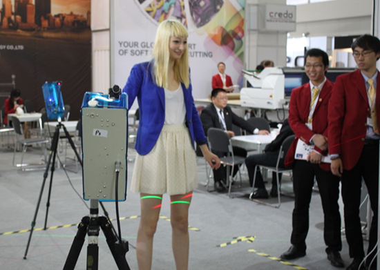 此次和鷹科技展出三維人體測量系統、吊掛系統以及定寸裁斷機贏得了包括業內和下游企業客戶的普遍關注。更有現場觀眾親身體驗了三維人體測量系統。如圖2 所示