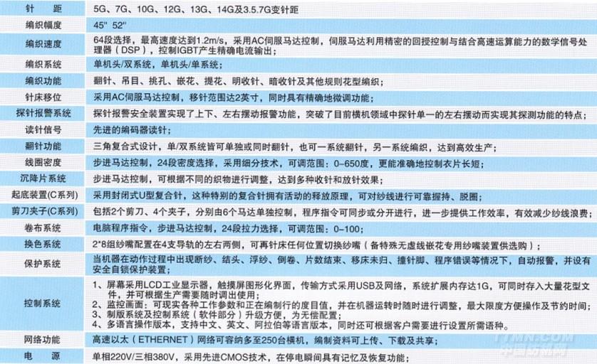 常熟市昌華針服機械廠擁有的CHJX-1-52-雙系統電腦橫機采用單機頭、雙系統的編織系統,翻針三角復合式設計,二個系統皆可單獨或同時翻針,也可一系統翻針,另一系統編織。電腦控制界面采用LCD菜單形式,使得操作簡單易懂。S系列配置起底板功能,實現了單片布面自動起頭、自動結束的功能,讓布片的編織過程更加智能,有效地減少了編織廢紗,提高了生產效率。機型編織內容豐富,主要用于羊毛衫的自動編織,適用于絲、棉、毛、滌綸、混紡等原料,可編織雙面提花、單面提花、單面無虛線提花、挑洞、絞花等有規則或無規則花樣。