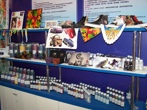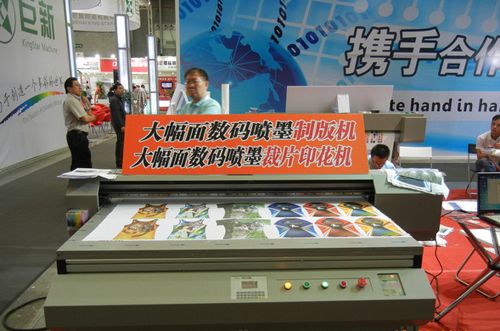 在展覽會上,e-Painter展示了EF1610/1625系列平板數碼印花機,并推出了針對T恤和裁片印花的數碼印花方案。圖片為e-Painter在展會上現場演示數碼印花方案。