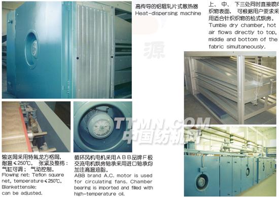 進(jìn)布有平進(jìn)或斜進(jìn)布兩種,烘房采用三層穿布,積木式設(shè)計(jì),每室烘房有二只循環(huán)風(fēng)機(jī),四只散熱器,噴風(fēng)由上、中、下三處同時(shí)直接噴向織物表面。