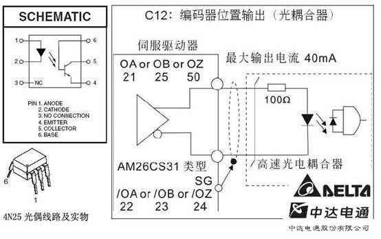 由于市場大多伺服系統驅動器為增量式編碼器,斷電不能記憶軸當前位置;本案通過4N25光偶連接PLC與伺服驅動器編碼器輸出口,通過PLC斷電記憶區來記憶斷電前位置值。其連接方式 如圖6
