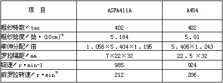 將ASFA411A型與A454型粗紗機對比,在配棉成分相同,清、梳、并、細機型和工藝條件相同情況下,用ASFA411A型和A454型粗紗機分別紡制粗紗,再用這兩種粗紗在細紗機上紡成C 18.2tex紗。測試粗紗、細紗質量,并進行對比。
