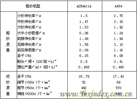ASFA411A型粗紗機的百錠斷頭明顯低于A454型機,其原因是該機型粗紗條干均勻,因此,強力弱環少,粗紗伸長率較小且穩定,大中小紗、前后排伸長率差異小,使粗紗張力穩定,突變張力小。用ASFA411A型粗紗機的粗紗紡出的細紗條干CV值、千米紗疵均比用A454型粗紗機的粗紗紡出的細紗低,這與喂入品粗紗條干均勻度是密切相關的。