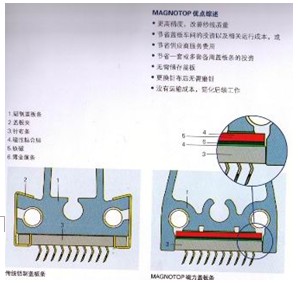 1.5.1、TC5-1梳棉機(jī)應(yīng)用了磁力蓋板系統(tǒng)MAGNOTOP,應(yīng)用磁性粘合層等新材料及新技術(shù)使蓋板的制做及維修工作大大間化,即省工又省時(shí),也不再需要許多空間面積,使運(yùn)行費(fèi)用大為降低。磁力蓋板技術(shù)MAGNOTOP的應(yīng)用還可隨時(shí)進(jìn)行新蓋板的更換試驗(yàn),蓋板針布裝拆很方便;應(yīng)用磁力蓋板的緊固系統(tǒng)NAGNOTOPDE 可