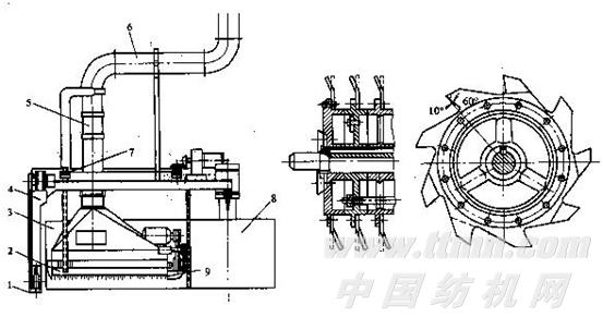 FA002型自動抓棉機(jī)結(jié)構(gòu)如圖2-2-1所示,由地軌1、外墻板3、抓棉小車4、伸縮管5、輸棉管6、小車升降鏈輪7、內(nèi)墻板8等組成。抓棉小車包括抓棉打手2、肋條9等機(jī)件,由支架聯(lián)接沿地軌作順時針方向運行,它的運行或停止受下一臺機(jī)械光電管控制,根據(jù)棉箱棉量高度決定是否運行,同時小車每回轉(zhuǎn)一周下降3~6mm,下降的距離由單輪行程開關(guān)開動的時間長短來控制。抓棉小車的升降由齒輪減速電動機(jī)通過鏈輪7、鏈條、四只螺母、四根絲桿傳動,小車運行到上、下極限位置時受限位開關(guān)控制。抓棉小車運行時,肋條9緊壓棉包,抓棉打手伸出肋條部分逐包抓取棉塊,由下臺機(jī)械上的凝棉器風(fēng)機(jī)或輸棉風(fēng)機(jī)產(chǎn)生的氣流經(jīng)輸棉管道輸送至下臺機(jī)器。抓棉小車連接的垂直部分輸棉管道可隨小車的升降而縮伸。當(dāng)抓棉打手因繞花堵車而降速到500r/min時,機(jī)架上的離心開關(guān)發(fā)出信號,使抓棉打手和小車電動機(jī)立即停轉(zhuǎn),通過人工排除故障后再重新啟動。