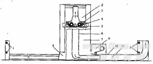 FA006往復式自動抓棉機結構如圖2-2-3所示,由抓棉小車8、轉塔7、抓棉頭2、打手3、肋條4、壓棉羅拉5、伸縮輸棉管6、卷繞裝置9、覆蓋帶10、輸棉道11、光電管1等組成。棉包堆在軌道兩則,抓棉器在一側抓棉的同時,另一側準備堆包。抓棉小車通過四個行走輪在地軌上作雙向往復運動。間歇下降的抓棉頭打手在隨轉塔作往復運動的同時,對棉包作順序抓取,被抓取的棉束在前方機臺凝棉器或輸棉風機的作用下經輸道管向前方機臺輸送。