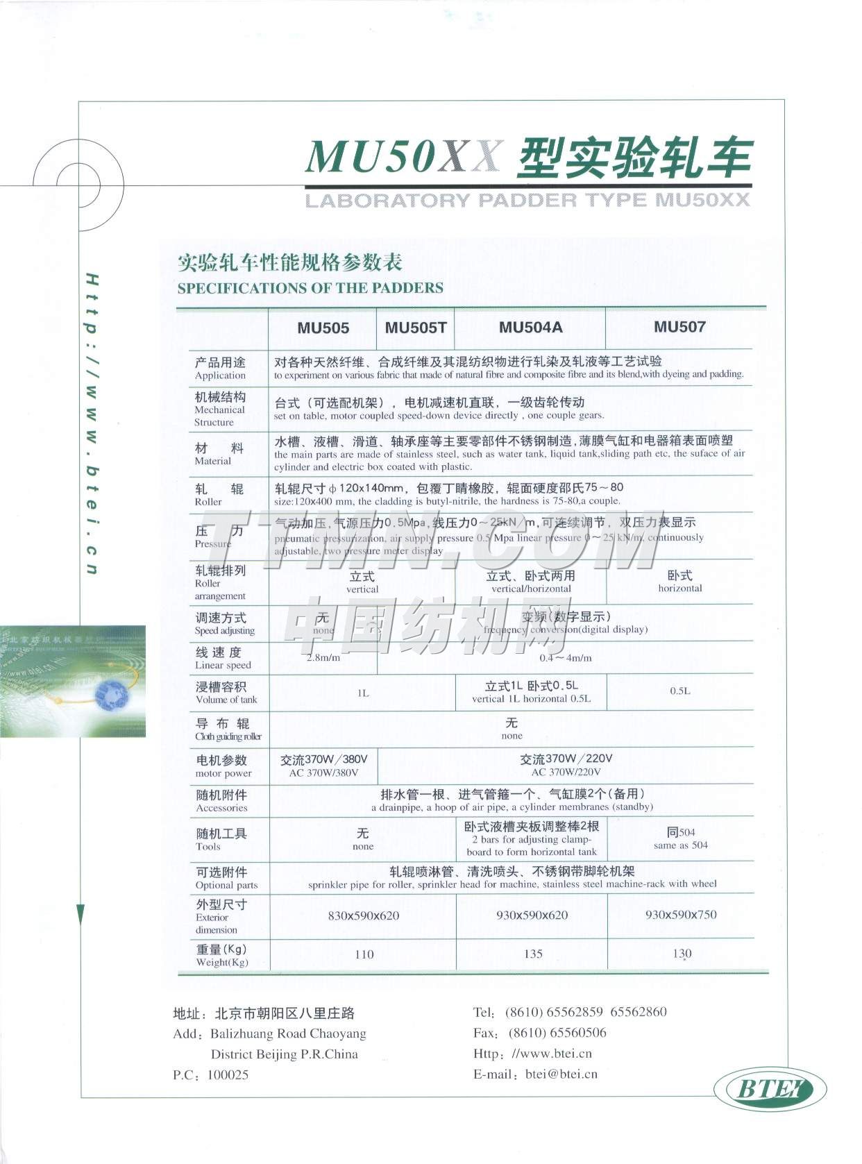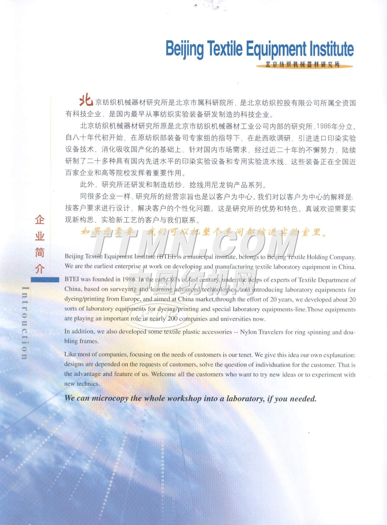 北京紡織機械器材研究所是北京市屬科研院所,是北京紡織控股有限公司所屬全資國有科技企業,是國內最早從事紡織實驗裝備研發制造的科技企業。   北京紡織機械器材研究所原是北京市紡織機械器材工業公司內部的研究所,1986年分立。自八十年代初開始,在原紡織部裝備司專家組的指導下,在赴西歐調研、引進進口染整實驗設備技術、消化吸收國產化的基礎上,針對國內市場需求,經過近二十年的不懈努力,陸續研制了二十多種具有國內先進水平的染整實驗設備和專用實驗流水線,這些裝備正在全國近百家企業和高等院校發揮著重要作用。   此外,研究所還研發和制造紡紗、捻線用尼龍鉤產品系列。   同很多企業一樣,研究所的經營宗旨也是以客戶為中心。我們對以客戶為中心的解釋是:按客戶要求進行設計,解決客戶的個性化問題。這是研究所的優勢和特色。真誠歡迎需要實現新構思、實驗新工藝的客戶與我們聯系。...