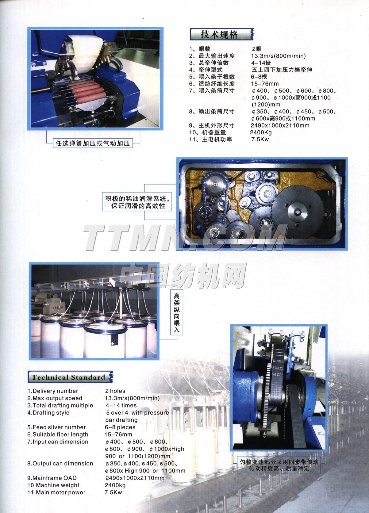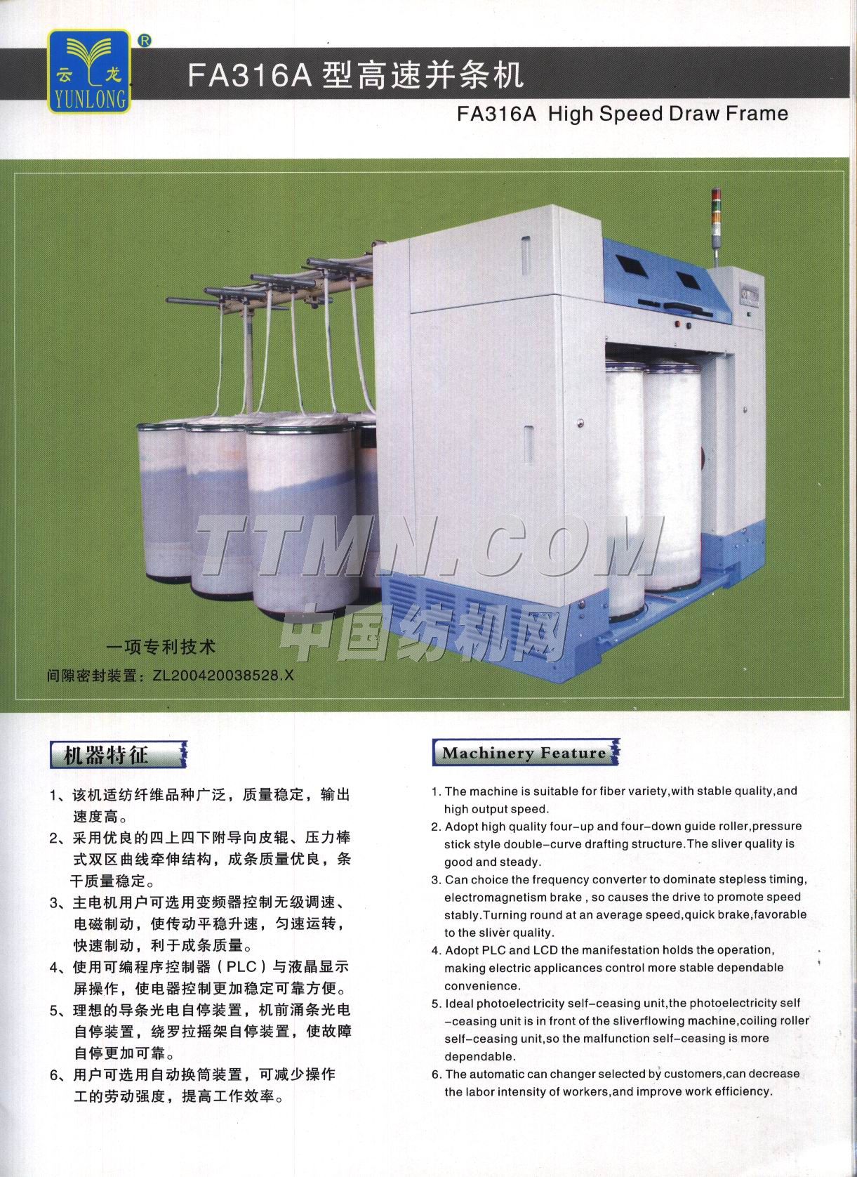 青島云龍紡織機械有限公司生產的“云龍”牌并條機有FA387、FA316、FA318、FA318A、FA396、FC300、 FA304A、FB400型八大系列,其中FA387采用數字化控制牽伸倍數,方便快捷,FA318獲得國家重點新產品,FA318A、FA396被山東省評為省科技進步一等獎、中國紡織協會二等獎。FA387、FA318A、FA396并條機達到國際先進水平。FC300型并條機適紡長纖維。規格品種齊全,設計先進,性能穩定、傳動合理。青島即墨第一紡織機械廠生產的“銀龍... |