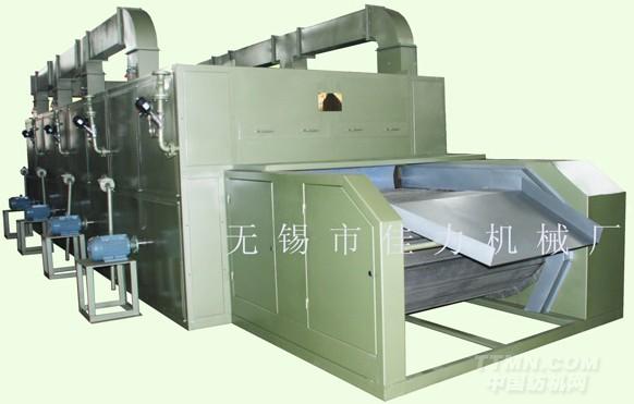 該機有機架、風扇、運毛簾、加熱器等組合而成,機架系由槽鋼、角鋼等組成,分成主室與側室兩部分,用鋼板隔離,主室安裝輸送簾板、加熱器及隔風板等,側室安裝風機、風導、調(diào)速電機及減速器。為防止熱量散失,四周板壁中裝有隔熱材料,主室裝有可坼卸的多塊小門板便于維修。各式頂部有兩個開口排氣孔,把它們連在一起把濕空氣排出機外,每個接口處裝有活動調(diào)節(jié)裝置,以調(diào)節(jié)排濕量。(據(jù)客戶要求,也可以安裝排濕風機,進行對外排出濕空氣。)