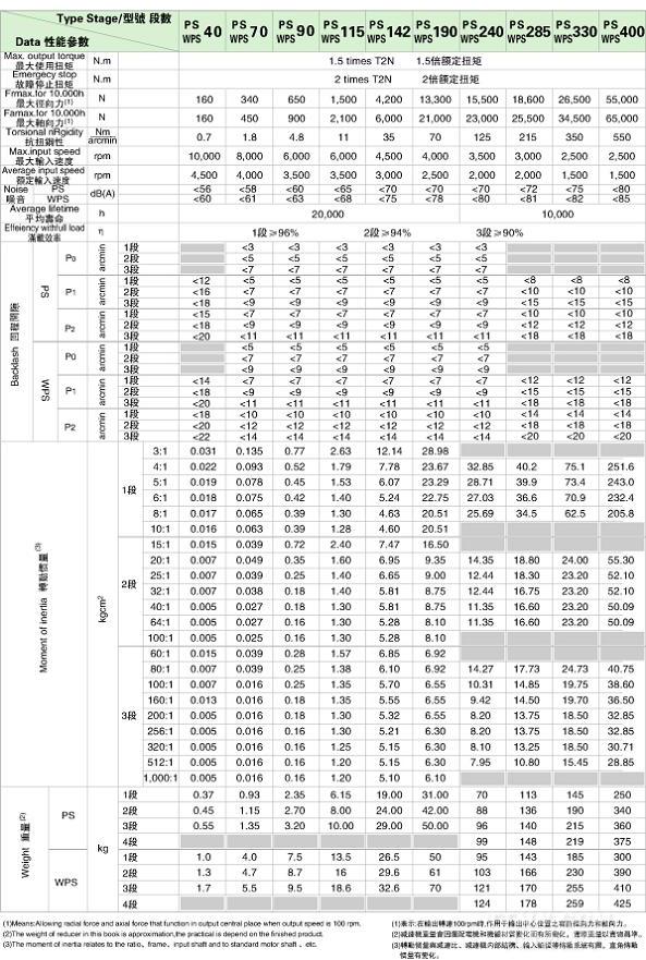 PS/WPS 系列精密行星減速機技術參數