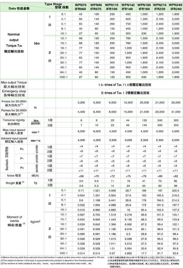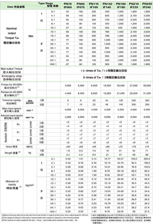 PN(IF)/WPN(IFR) 系列精密行星減速機技術參數