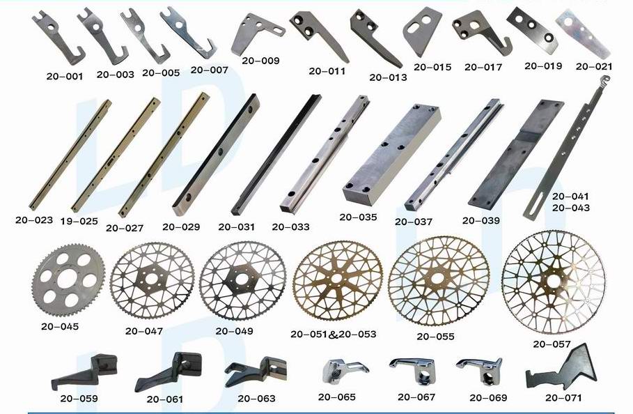 片梭、片梭殼體、片梭紗夾、離合器、角度盤、摩擦片、剎車鋼帶、 皮帶輪、導梭齒、回梭鏈、P7200齒型帶、打緯箱、連軸器、投梭滑塊、 弧形擺桿、投梭凸輪、投梭擺軸、扭軸長套筒、扭軸法蘭、升梭器、 升梭器蓋板、投梭側打開鉤、張開器、上導軌、下導軌、導梭口、剪刀座、 定中心片、遞緯總成、混緯紗夾、遞緯擺桿、選色器、接梭側打開鉤、 壓梭錘、回梭桿、探梭桿、制梭器總成、制梭襯夾板、制梭皮、布邊鉤針、 布邊紗夾、布邊壓腳、邊撐蓋、混緯連桿座、張力片、摩擦圈、渦輪、 踏盤、卷取渦輪、緯密變換齒輪、傳感器、金屬傳劍輪、導劍鉤、劍頭、噴嘴