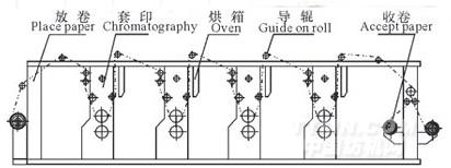 2、套印機組、用氣動壓印,氣動頂花棍。縱向對花微動差速機鉤,刮墨刀,刀向手動調節。